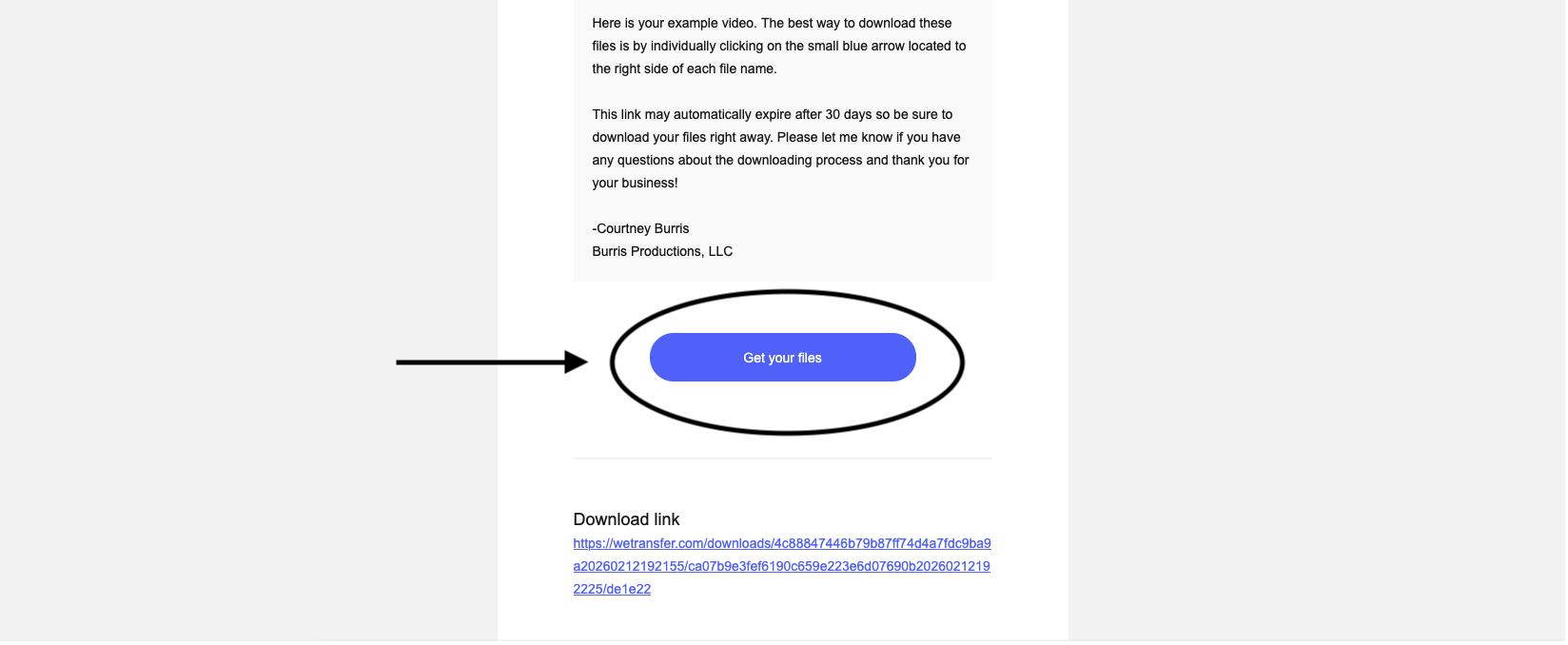 Once you open the email from wetransfer scroll down until you see the blue button that says “Get your Files”. Click on that button.