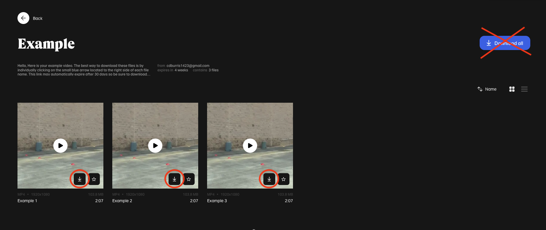You will then see all of your video files. On each file there will be an arrow pointing down. (circled in red in the picture) Click on each arrow individually, to download each file separately.